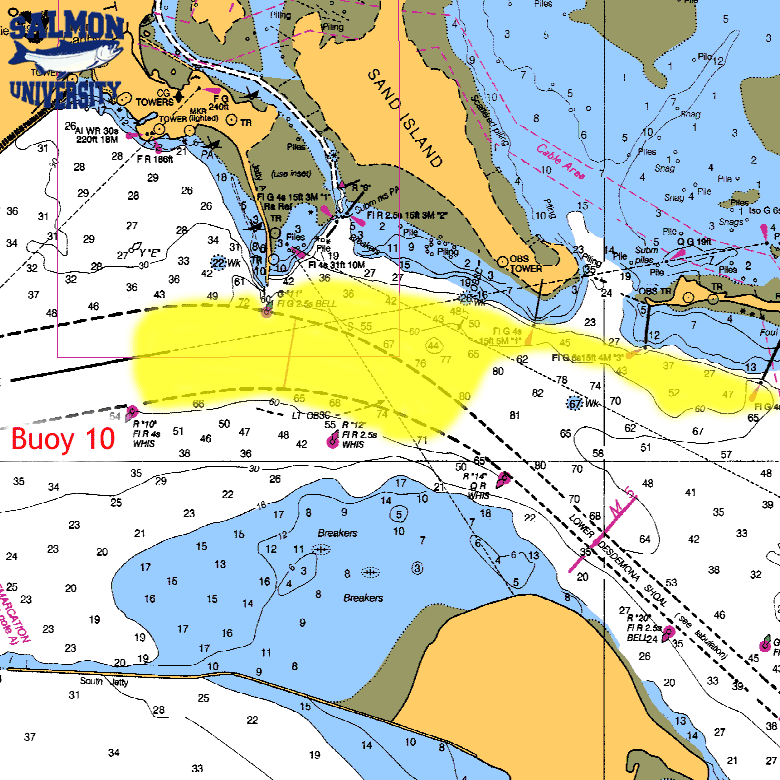 Most salmon fishing early in the season will be near Buoy 10 at low incoming tide, some prefer just north while others prefer south of the buoy. When fishing for Chinook early in the season, a trend is to be at the buoy at low incoming tide & allow the tide to carry you upriver along the Oregon side, sliding across & over to the Washington side just above Chinook. There seem to be good bait holding spots off the breakwater piling on the Washington side near both Big & Little Sand Islands on the high ebb.