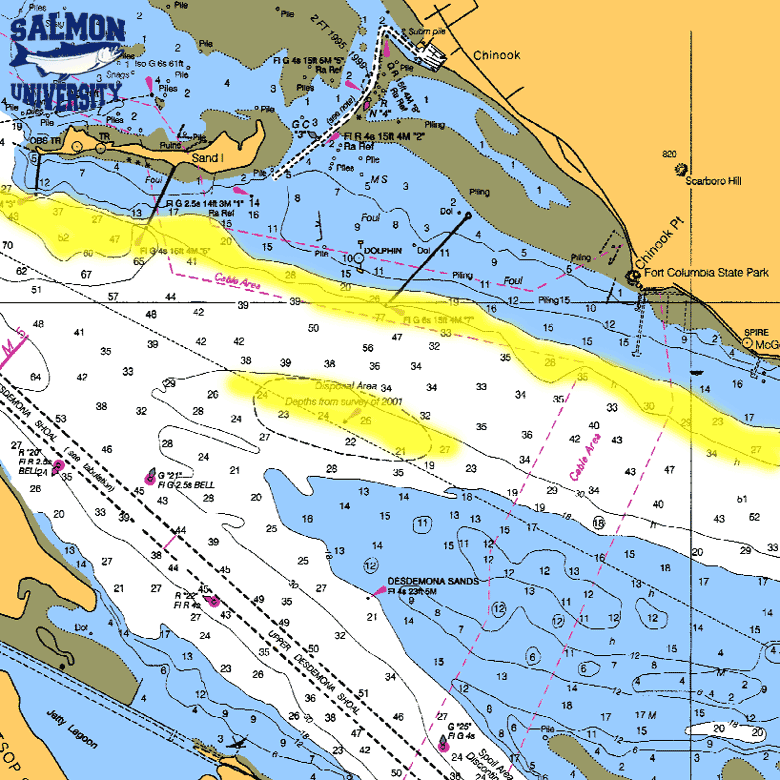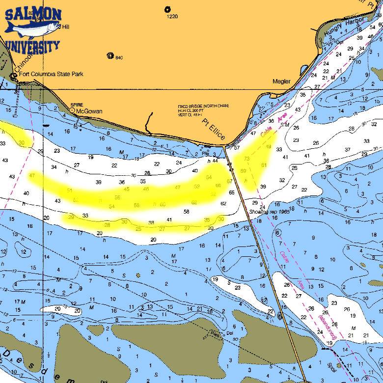 There is also a 50'/60' slot at the "Church Hole" which is between the Chinook entrance & upriver to the bridge on the Washington side, where many chinook salmon are taken. There is a old church on the Washington shore that is right on the shore & its steeple is very visible, hence the name. The charts may only say "Spire" on the shore in this location. The other area where many fish are taken is again from the church to the bridge but farther away from shore in the 30' slot. As the tide nears & goes into high slack, the fish then seem to congregate above the bridge & up to the WDOT rest area. This area near the Washington shore has also been called the "Blind Channel."
